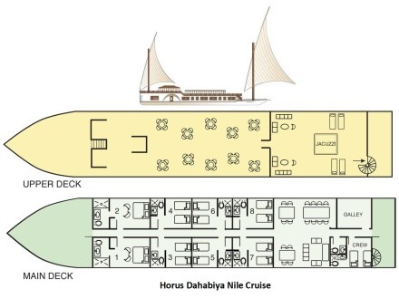 Saphir dahabiya offers you six luxury cabins ( rooms ) and two fancy suite with all the facility like large ‎panoramic window, privet bathrooms, spacious sundeck with a jacuzzi, a comfortable lounge and a dining ‎room, Our Dahabiya Saphir has no engines and completely depend on wind and current. You only hear the marvel sound of the breeze through the sail and the water breaking over the bow. A small tug can help if the natural elements fail. On board Dahabiya Saphir is the exceptional dining experience. The onboard chefs prepare delicious meals using fresh and locally sourced ingredients. Passengers can savor a variety of culinary delights, including traditional Egyptian cuisine and international dishes.